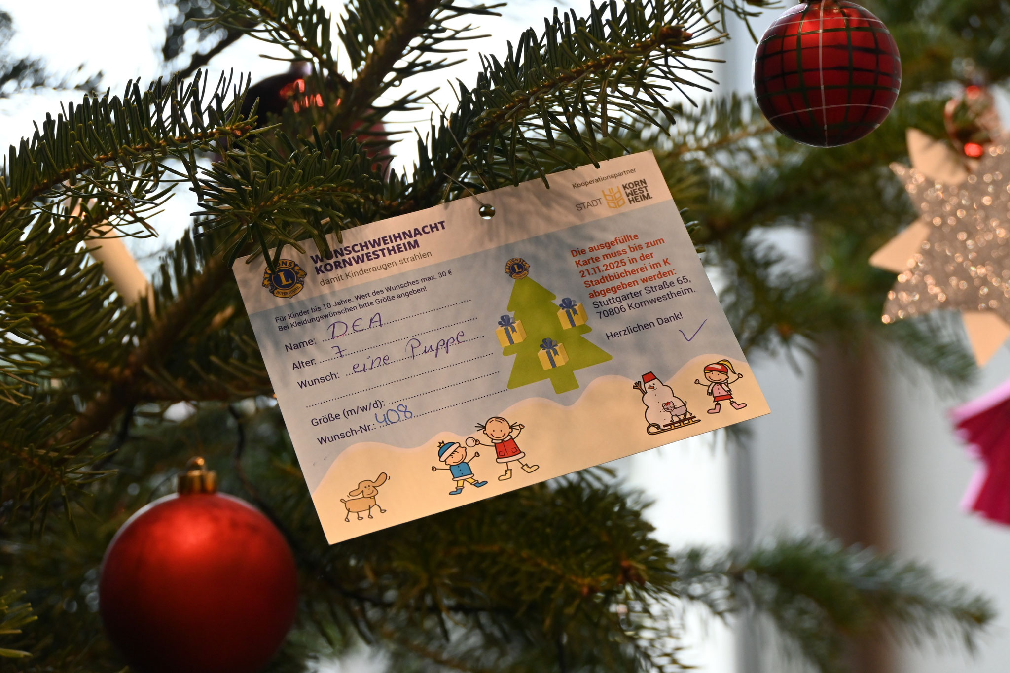 Der Kornwestheimer OB Nico Lauxmann half kräftig mit, als Kindergartenkinder den diesjährigen Wunschweihnachtsbaum in der Stadtbücherei schmückten. 435 Karten haben die Lions an Kindergärten und Familien ausgegeben - verteilt durch die Stadt Kornwestheim. Darauf können Kinder oder ihre Eltern einen Wunsch bis zu einer Höhe von 25 Euro angeben und in der Bücherei abgeben. Die Kindergartenkinder schmückten nun den Wunschweihnachtsbaum, an dem schon die ersten ausgefüllten Karten aufgehängt wurden. Die Bevölkerung ist aufgerufen, sich jeweils eine Karte zu nehmen und den Wunsch anonym zu erfüllen - bis zur großen gemeinsamen Bescherung am 14. Dezember. Die Lions organisieren, dass kein Kind leer ausgeht.