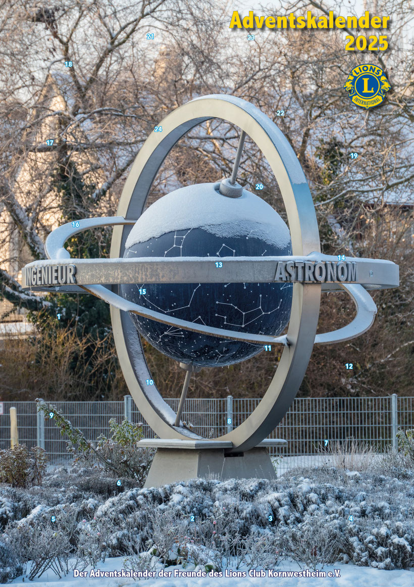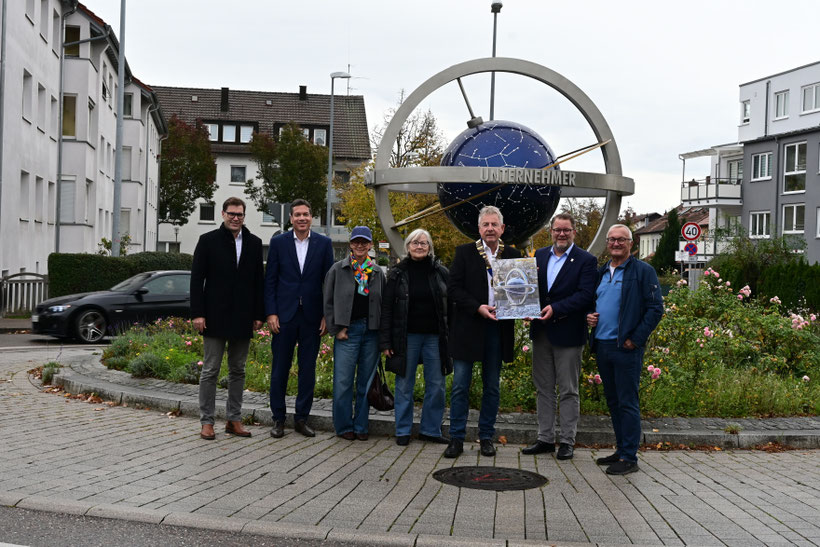 Die Stadt Kornwestheim hat dem berühmten Mechanikerpfarrer Philipp Matthäus Hahn ein Denkmal gesetzt: einen eigenen Kreisverkehr mit der Weltkugel, umrundet von astronomischen Sternenbahnen. Dieses Motiv hat der Lions Club zu seinem Foto des Adventskalenders 2025 gewählt. Traditionell empfing OB Nico Lauxmann ( 2.v.r.) aus der Hand von Präsident Michael Fischer ( 3.v.r.) den Kalender mit der Losnummer Eins. Mit dabei ( von links nach rechts) Bürgermeister Daniel Güthler, Timo Scheer von der Kreissparkasse, die den Hauptpreis stiftete, und das Adventskalenderteam mit Silke Holzbog, Heiderose Bideaux und Alfred Waldenmaier. Der Kalender wird für fünf Euro verkauft. Der Erlös kommt Kindern und Jugendlichen in Kornwestheim zu Gute. Verkaufsstart ist auf der Kirbe. Den Kalender gibt es außerdem an jedem Wochenmarktfreitag und ständig bei Foto Bartmann, Treffpunkt Hauser und Bücher Lurch.